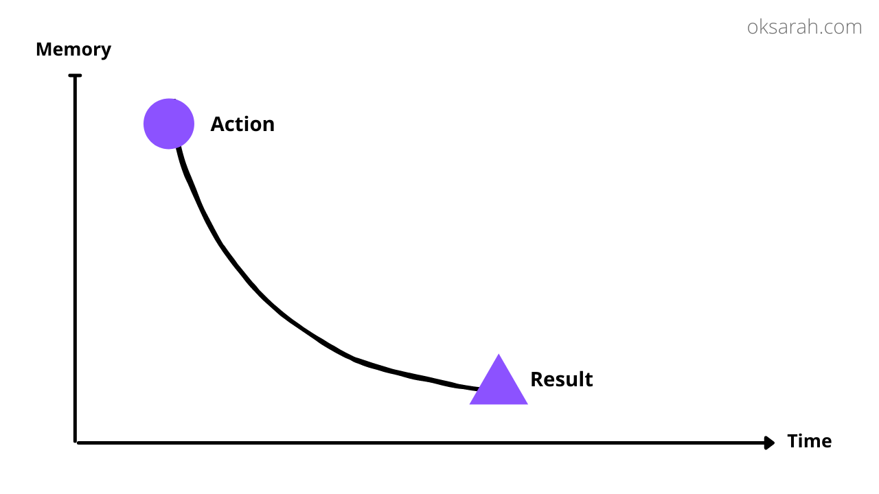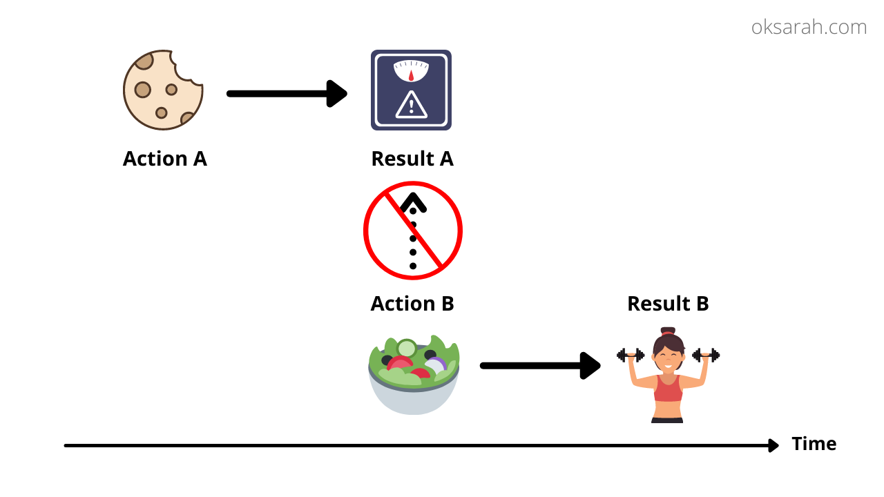 As depicted in the diagram above, I see result A (no sick pack) and falsely attribute it to action B (eat a salad) because they occurred at roughly the same time. The chronological proximity of these two points makes me think they're correlated. Yet in reality, it's action A (overate dessert) that produced result A (no sick pack). Most consequences take time to unfold. Understanding this delay reminds me that eating well today may not show until weeks or months from now.